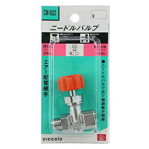 【用途】エアー配管経路の開閉、流量調整。【機能・特徴】ニードルバルブと継手の一体化で接続の省力化を図っています。おねじ・めねじタイプです。腐食しにくいクロームメッキ仕上げです。【仕様】●接続ねじ:おねじR1/4(PT1/4)・めねじRc1/4(PT1/4)。●適用流体:空気。【商品サイズ】幅40×高さ55×奥行20mm 重量100g【荷造り・送料】大工道具・作業工具・先端工具・電動工具・園芸機器分について「1梱包1100円」、北海道は1梱包1375円を申し受けます。(この分類商品で3980円(税込)以上購入の場合は送料無料・北海道は送料無料対象外となります)※沖縄・離島は送料実費(お見積)申し・・・