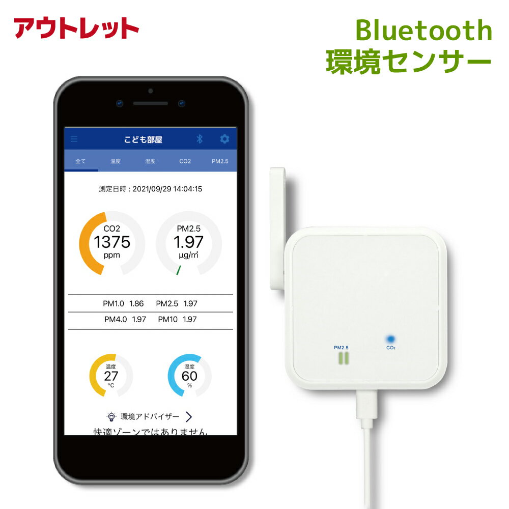 【アウトレット理由】パッケージ汚れ ■こちらもおススメ Wi-Fi 環境センサー ⇒ 詳細はコチラ Wi-Fi CO2センサー ⇒ 詳細はコチラ ■製品仕様 名称 Bluetooth 環境センサー 対応スマートフォン、 タブレット ・iOS 12以降 ・Android 6以降 ※最新のiOS/Androidバージョンにアップデートしてお使いください。 ※専用アプリをApp Store、Google Playからダウンロードする必要があります。 無線部 準拠規格 Bluetooth 5 使用周波数帯域 2.4GHz 通信距離 最大20m(見通し) センサー CO2 方式:光音響NDIR方式(PA・・・